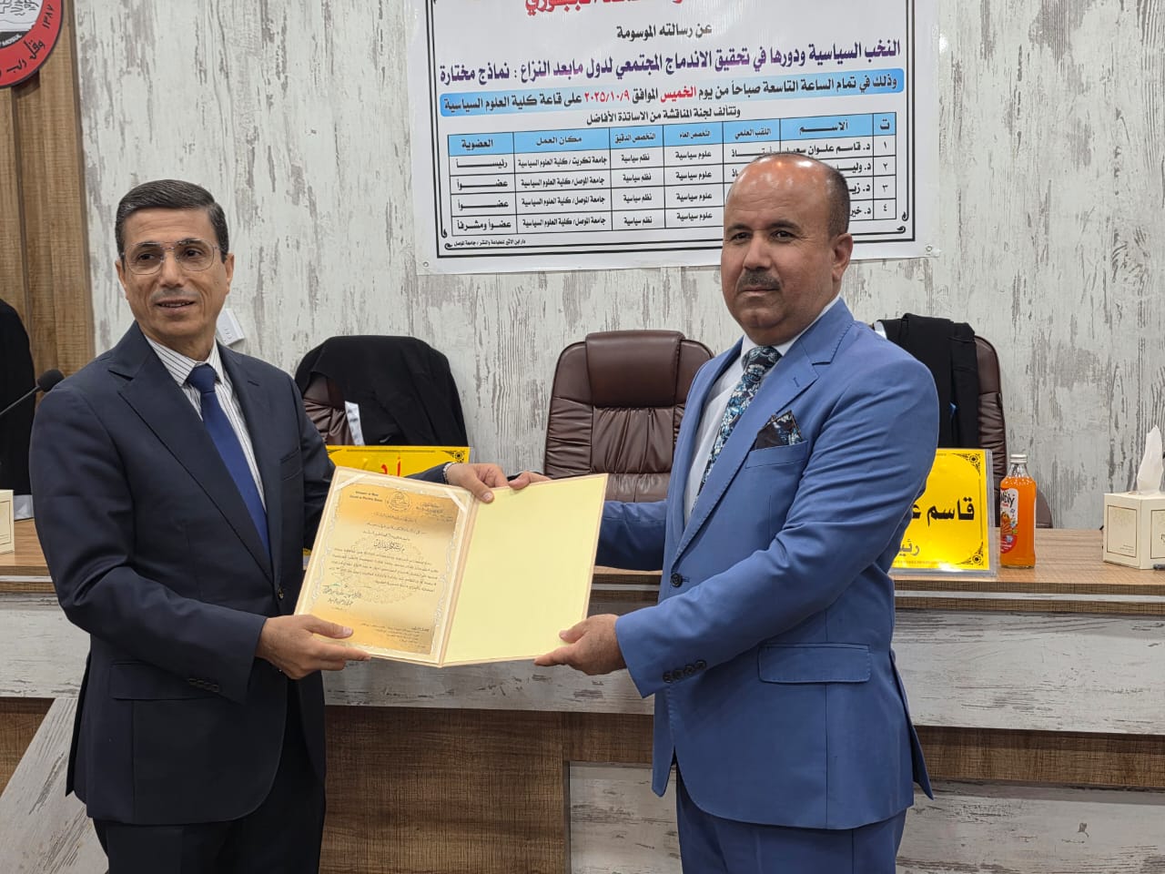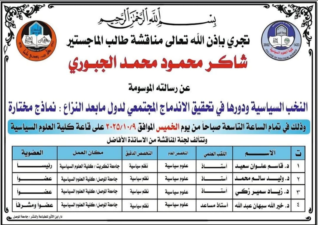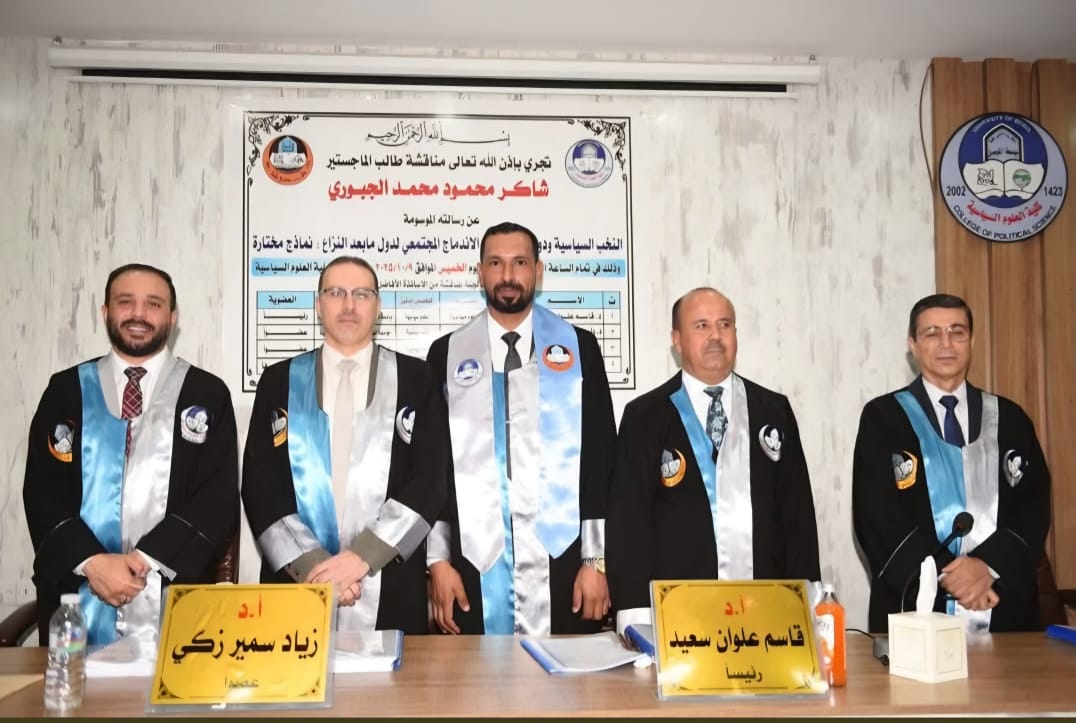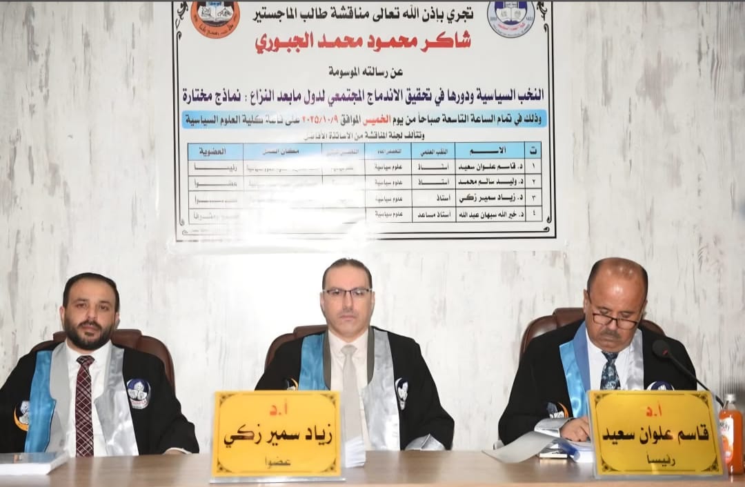 ترأس السيد العميد الأستاذ الدكتور قاسم علوان سعيد لجنة مناقشة رسالة الماجستير للطالب (شاكر محمود محمد) الموسومة "النخب السياسية ودورها في تحقيق الاندماج المجتمعي لدول ما بعد النزاع: نماذج مختارة" وذلك صباح يوم الخميس الموافق 9/10/2025. على قاعة كلية العلوم السياسية في جامعة الموصل.