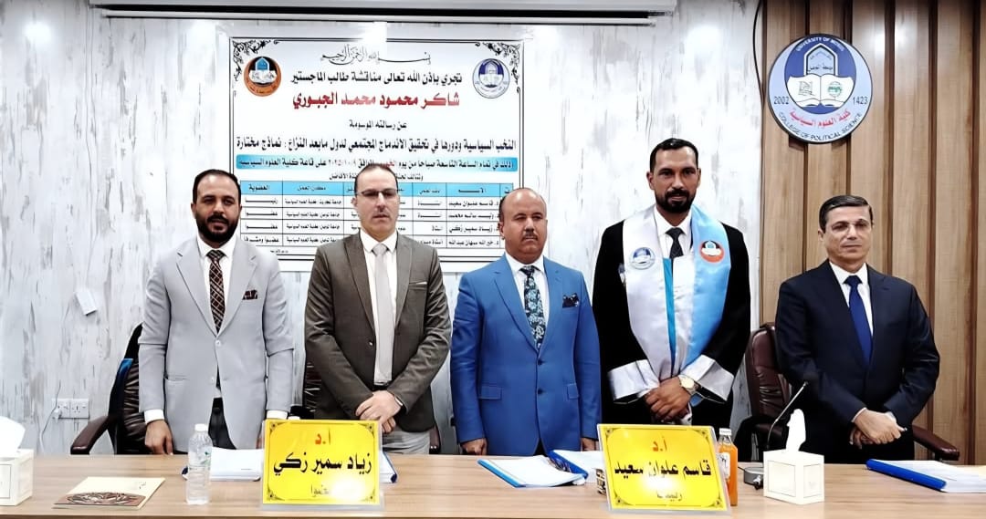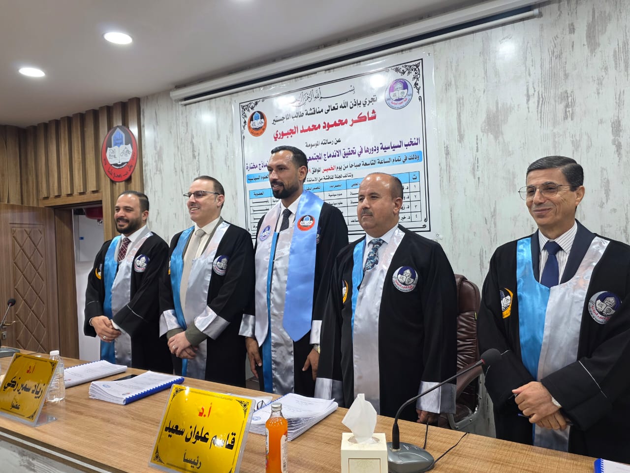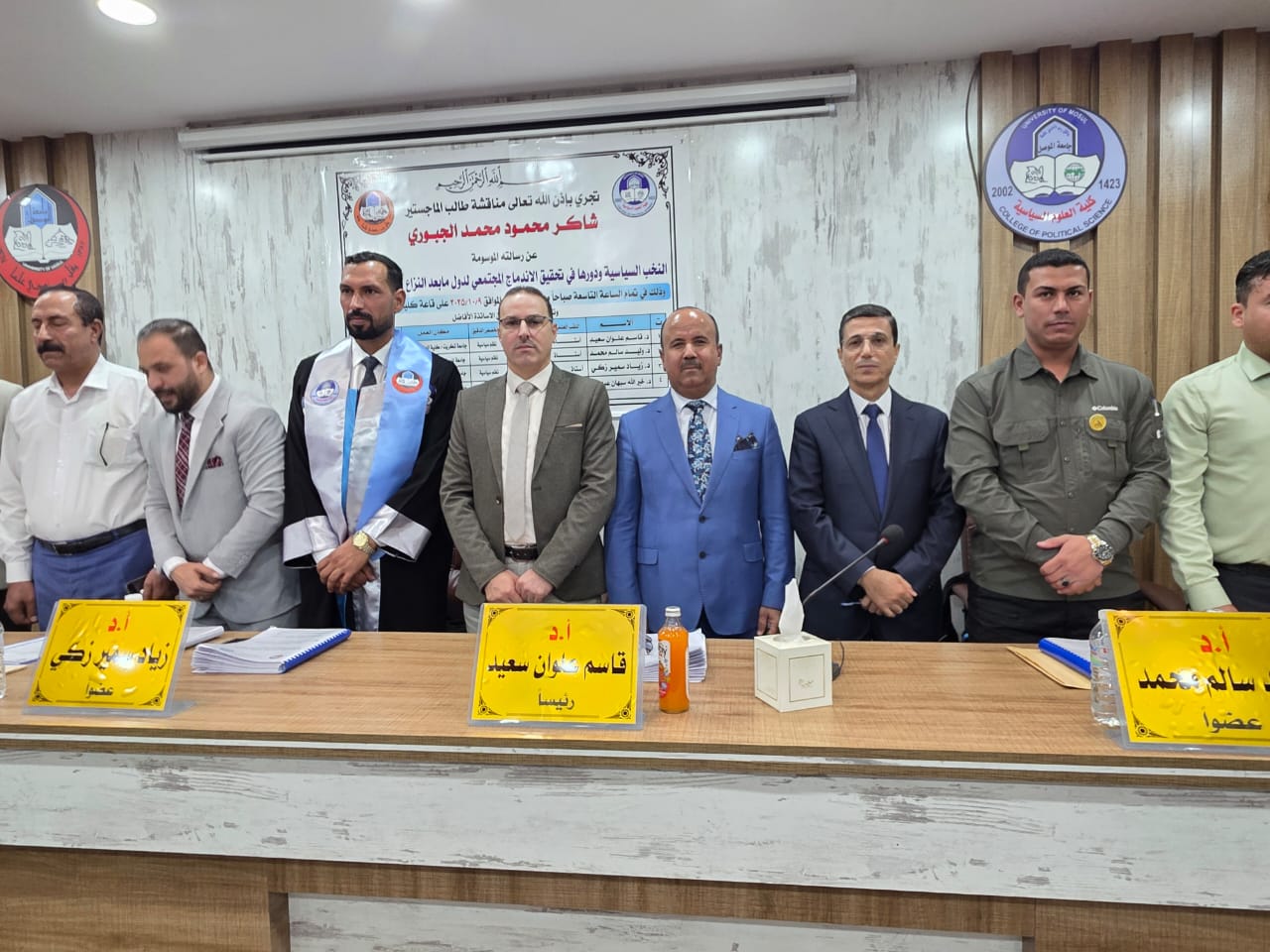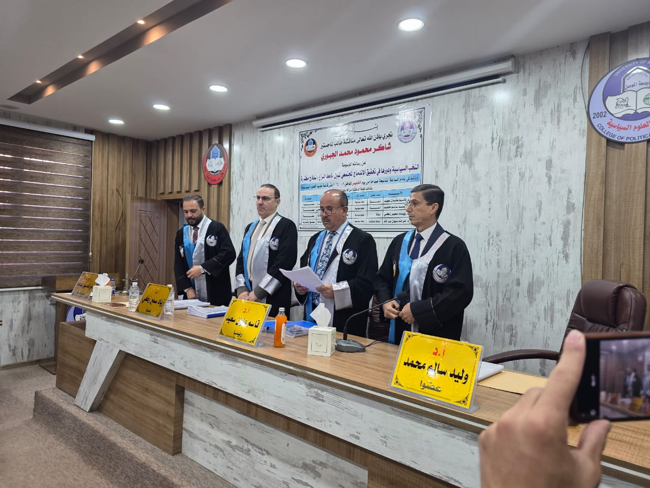 ترأس السيد العميد الأستاذ الدكتور قاسم علوان سعيد لجنة مناقشة رسالة الماجستير للطالب (شاكر محمود محمد) الموسومة "النخب السياسية ودورها في تحقيق الاندماج المجتمعي لدول ما بعد النزاع: نماذج مختارة" وذلك صباح يوم الخميس الموافق 9/10/2025. على قاعة كلية العلوم السياسية في جامعة الموصل.