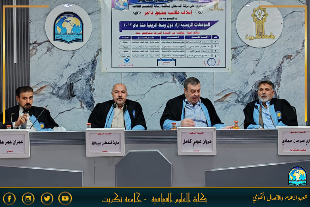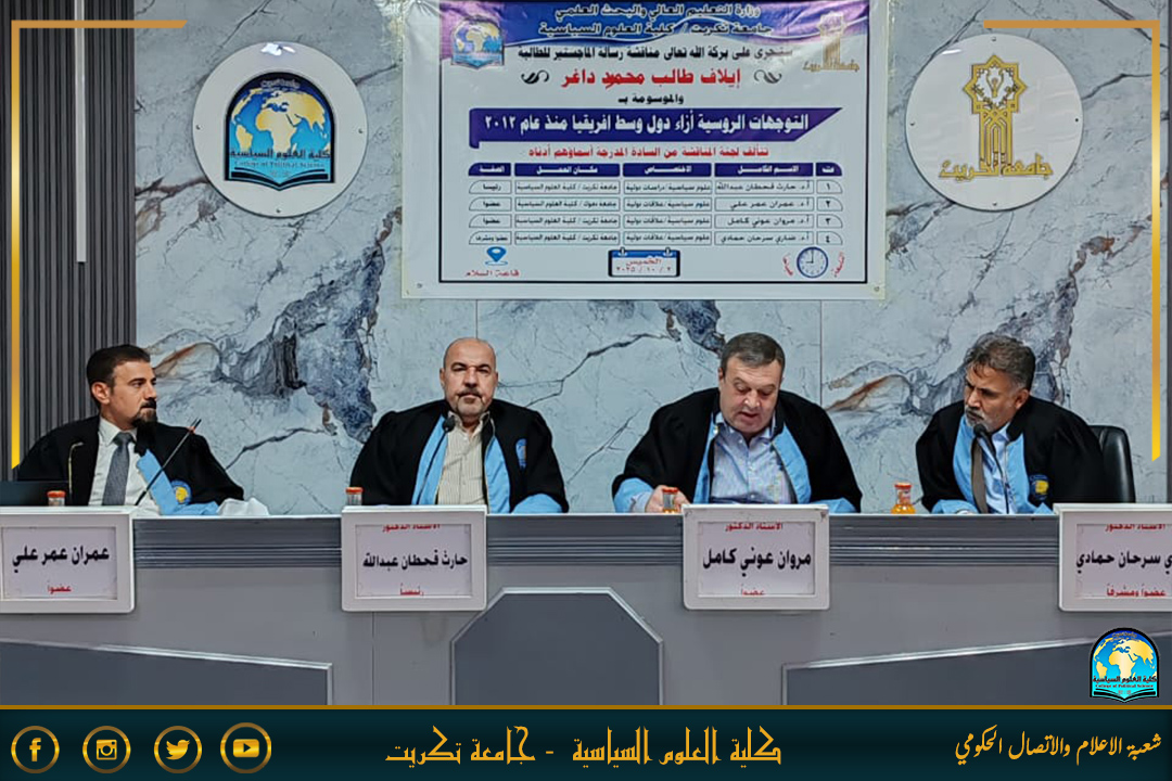 نوقشت في كلية العلوم السياسية رسالة الماجستير الموسومة بـ(التوجهات الروسية إزاء دول وسط إفريقيا منذ عام 2012) للطالبة ايلاف طالب محمود على قاعة السلام اليوم الخميس الموافق 2/10/2025.