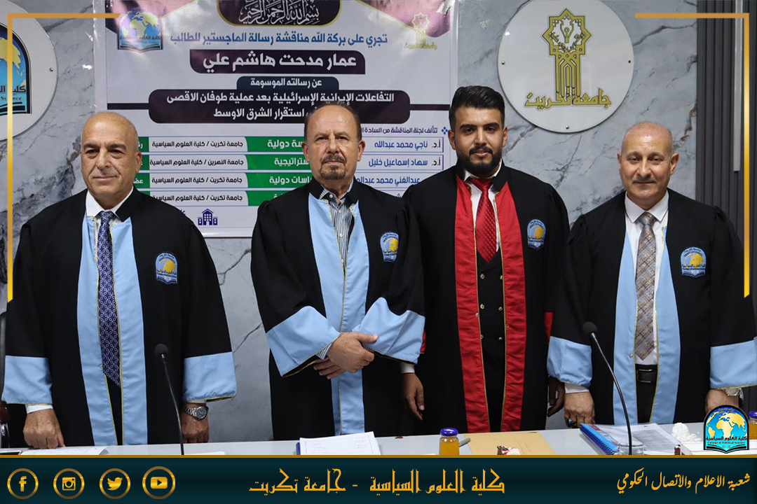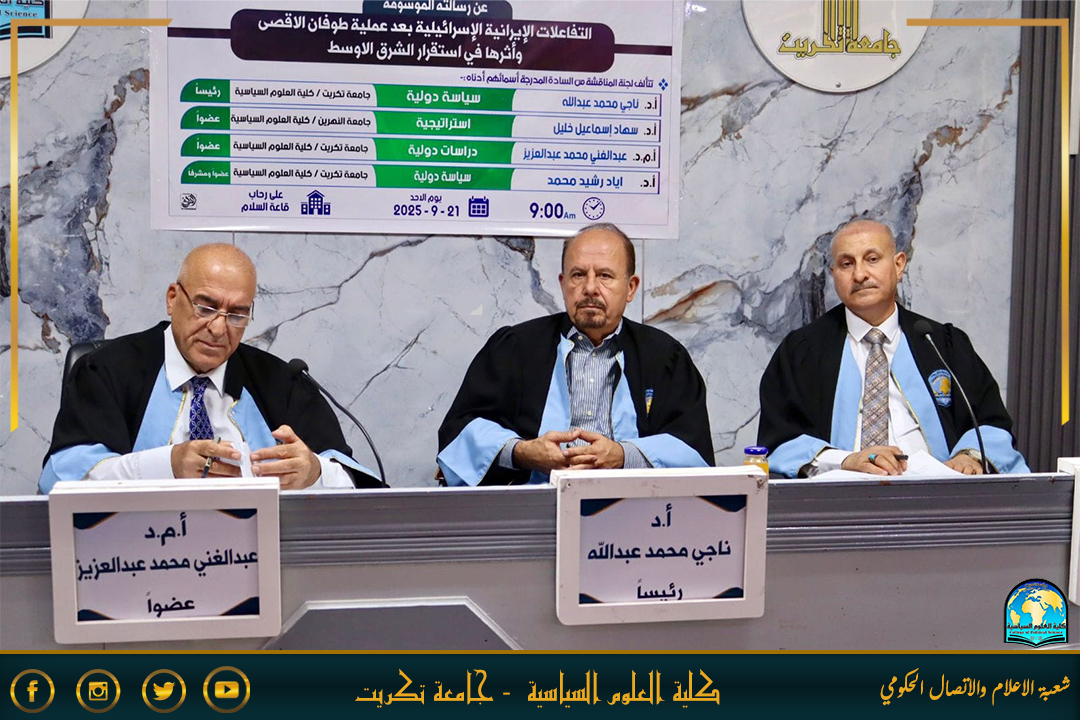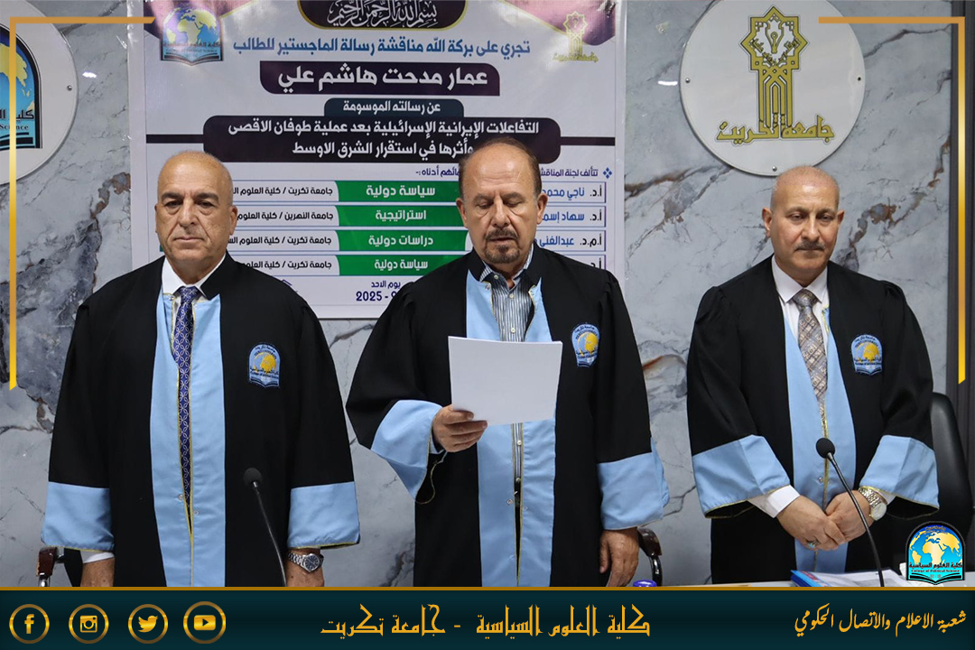 نوقشت في كلية العلوم السياسية رسالة الماجستير الموسومة بـ(التفاعلات الإيرانية (الإسرائيلية) بعد عملية طوفان الأقصى واثرها في استقرار الشرق الأوسط) للطالب عمـــار مدحت هـــاشم على قاعة السلام اليوم الاحد الموافق 21/9/2025.