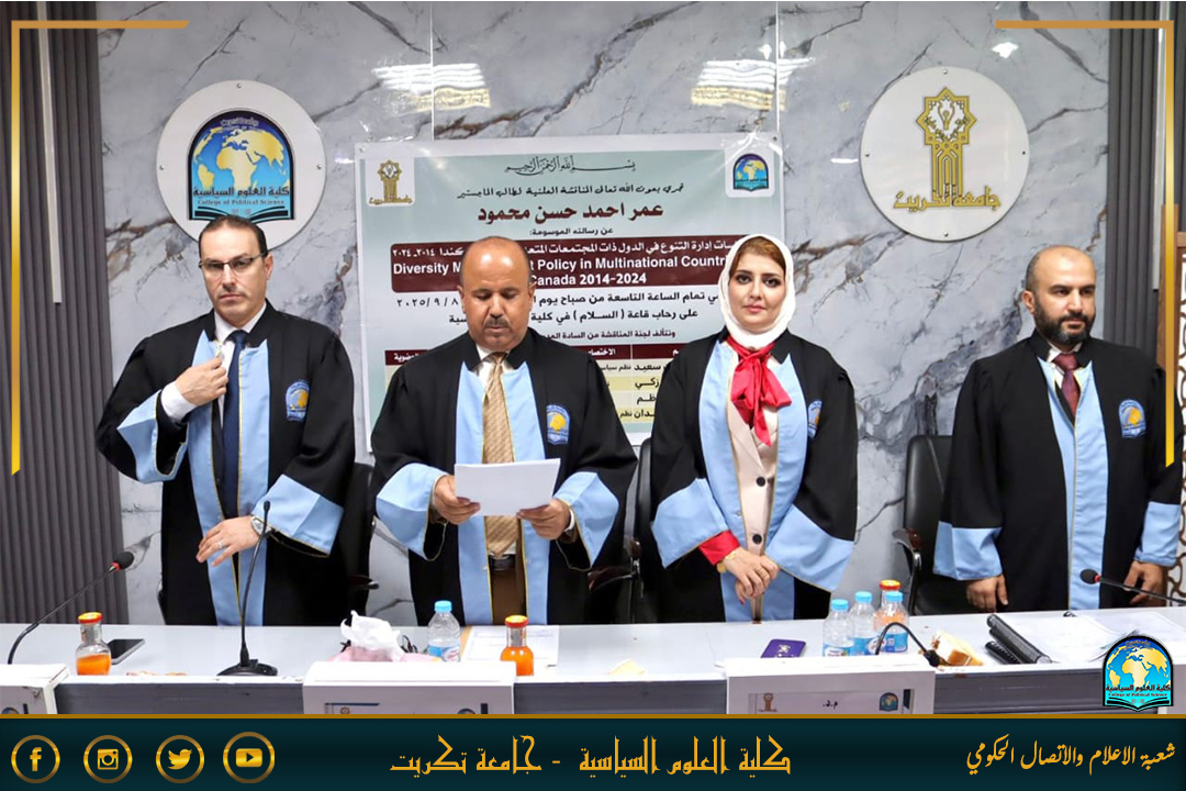 نوقشت في كلية العلوم السياسية رسالة الماجستير الموسومة بـ(سياسات ادارة التنوع في الدول ذات المجتمعات المتعددة : العراق وكندا 2014 - 2024) للطالب عمر احمد حسن على قاعة السلام اليوم الاثنين الموافق 8/9/2025.