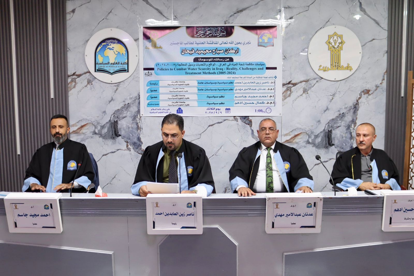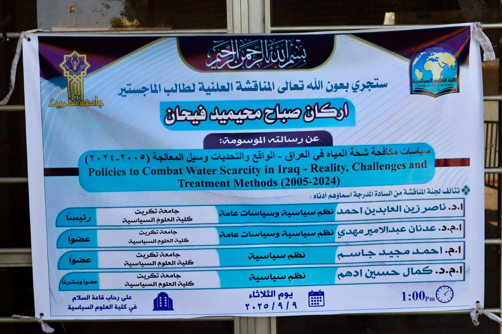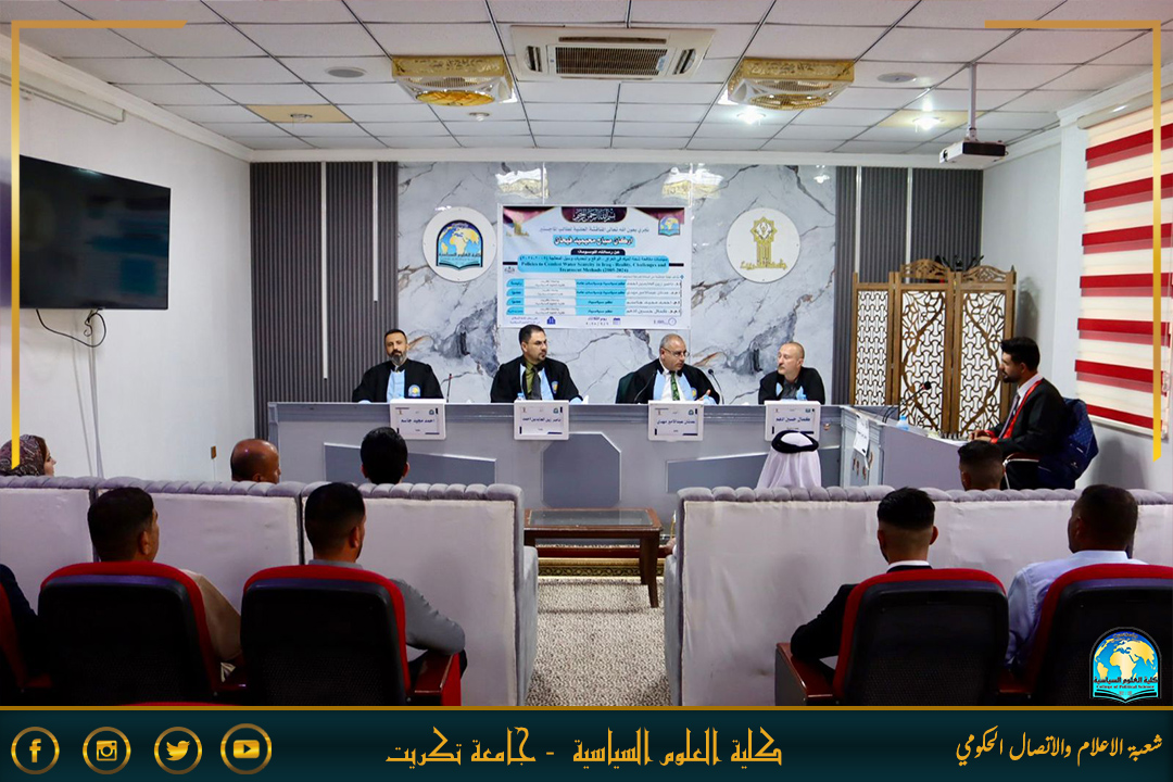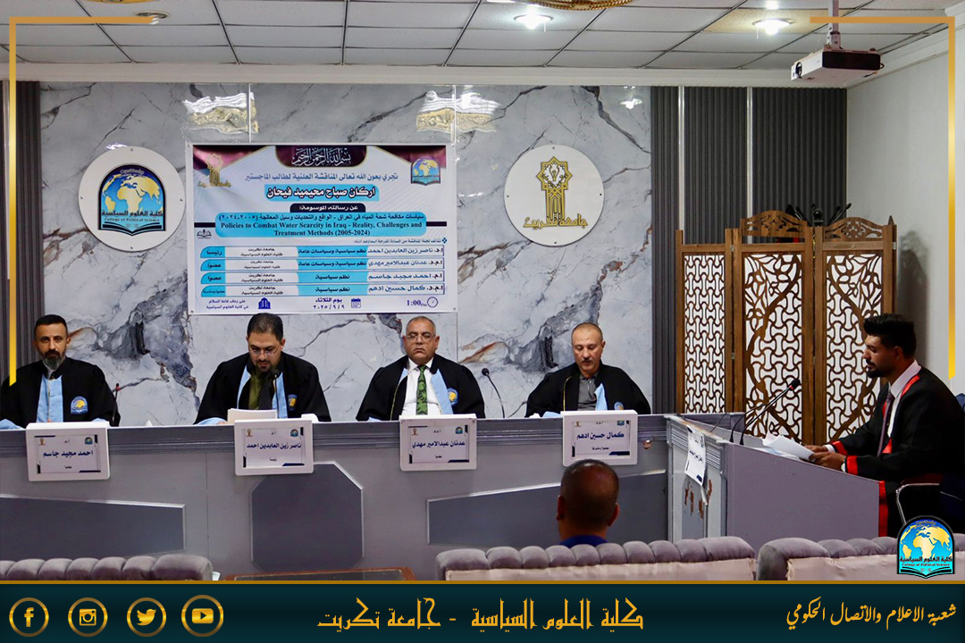 نوقشت في كلية العلوم السياسية رسالة الماجستير الموسومة بـ(سياسات مكافحة شحة المياه في العراق - الواقع والتحديات وسبل المعالجة (2005-2024)) للطالب اركان صباح محيميد على قاعة السلام اليوم الثلاثاء الموافق 9/9/2025.