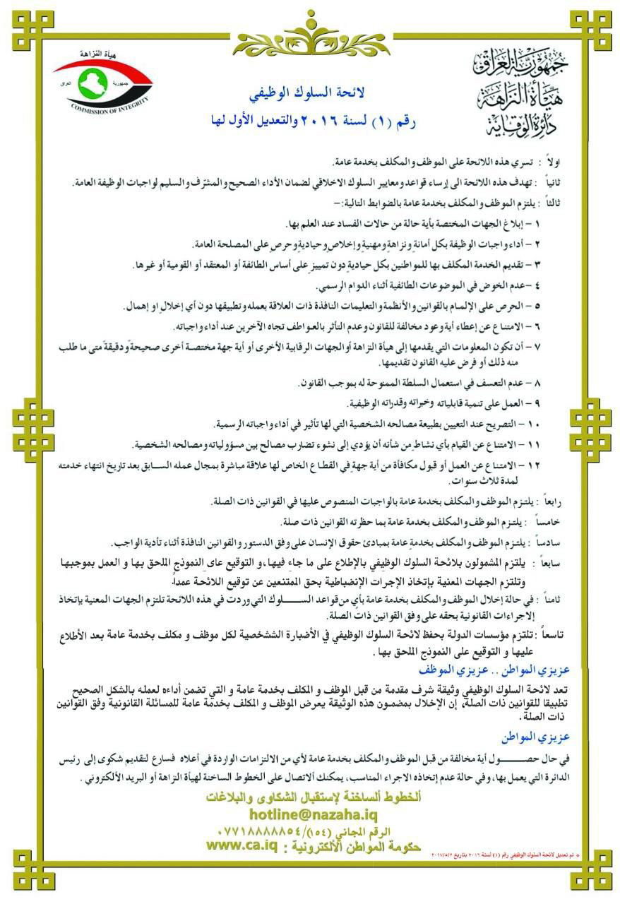 لائحة السلوك الوظيفي رقم (1) لسنة 2016 والتعديل الاول لها